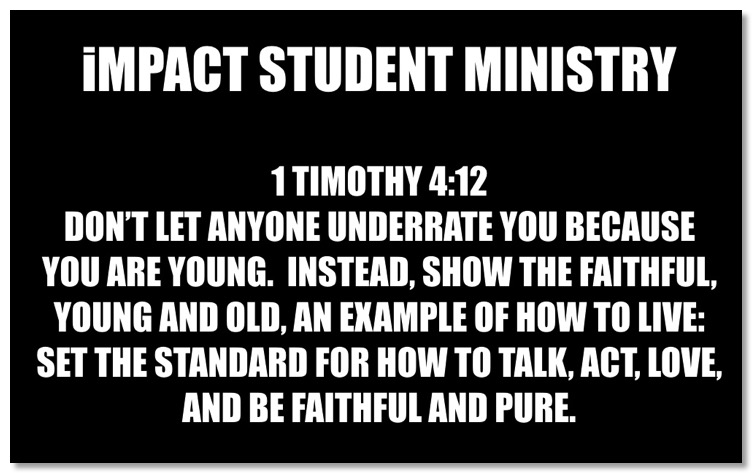iMPACT STUDENTS ARE MUCH MORE THAN A MINISTRY ITS A MOVEMENT OF STUDENTS THAT GATHER SUNDAYS @ 5:30PM FOR THEIR LARGE GATHERING, WEDNESDAYS @ 6:30 FOR iMPACT PLUS. IF YOU HAVE A STUDENT AGE 6TH GRADE TO 12TH GRADE, PASTOR TIM AND HIS YOUTH LEADERSHIP WOULD LOVE TO HAVE THEM COME AND BE A PART OF iMPACT.